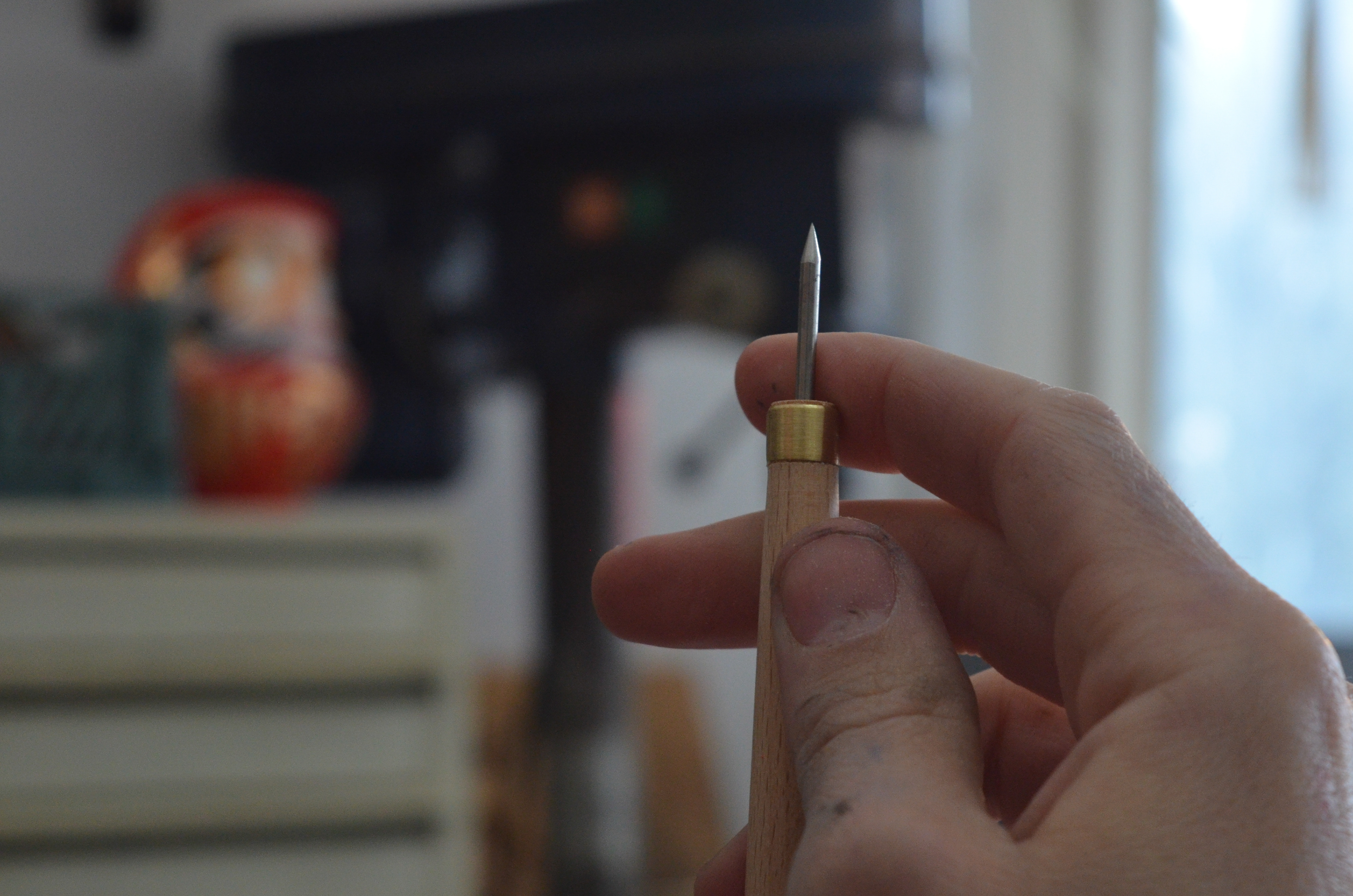 מבוסס על כלי מעולם הצורפות והתחריט המסרותי, הכלי נותן אפשרויות שונות של קוים עדינים הכלי מאפשר במקרים מסויימים למחוק קווים בפלטת התחריט.